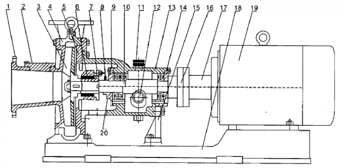 16. Coupling on pump end | 17. Coupling for motor end | 18.Base plate | 19. Electric motor | 20. Couplingguard |